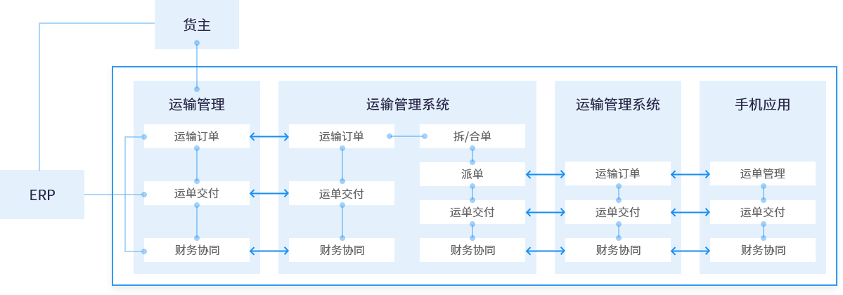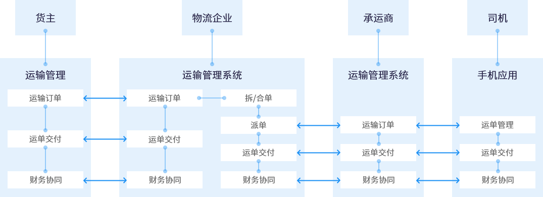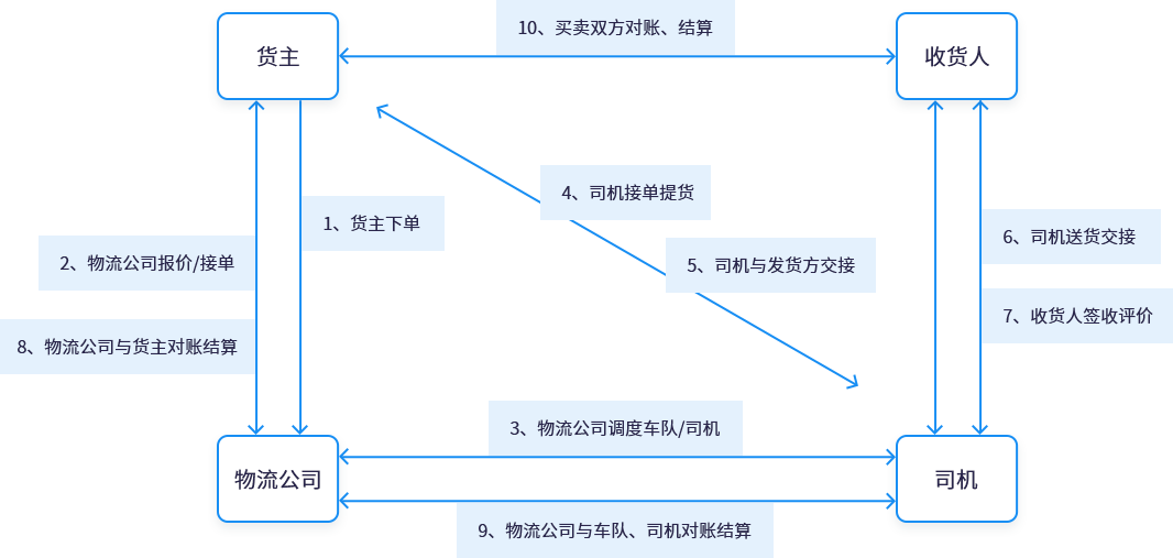 货主通过指派或询价模式将订单发送给物流公司 → 物流公司根据不同货主的订单,可进行内部计划管理(线路拆分、货量拆分、装载优化) → 物流公司可将 订单派发给自营车辆或将订单转派给外包商运输执行 → 司机接收运单后,可根据运单信息进行在线导航、提送货反馈 → 收货人可进行物流跟踪(查看物流节 点、运输轨迹)、签收评价