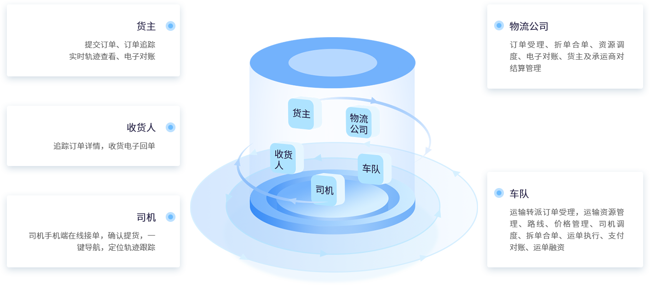 衔接货主、物流企业、司机,对接货主起运地、物流园区分拨中心、 专线、配送中心、目的地,集多种运输场景,多线路协同的物流管理协同平台。